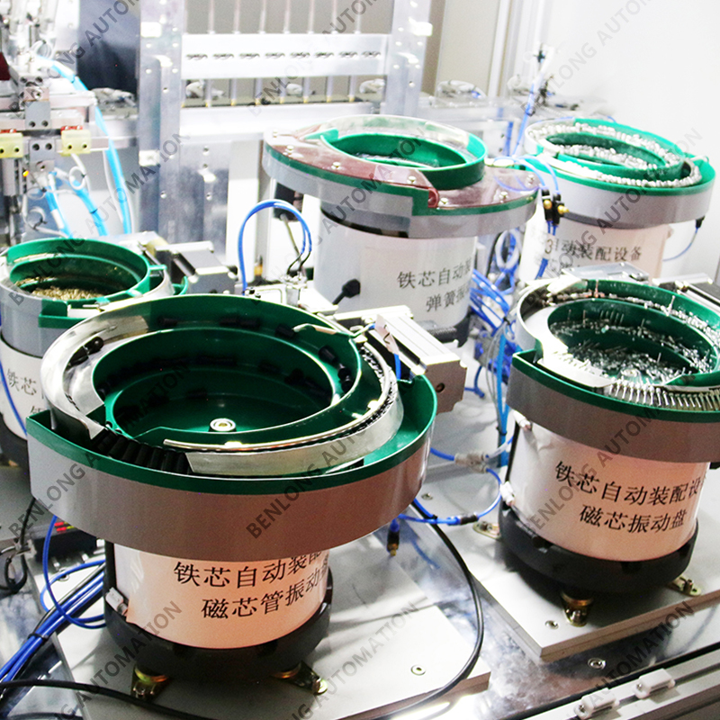 具有自动静铁芯、弹簧、动铁芯、绝缘壳、顶针上料组装、合格不合格区分、下料、包装工序的装配、在线检测、